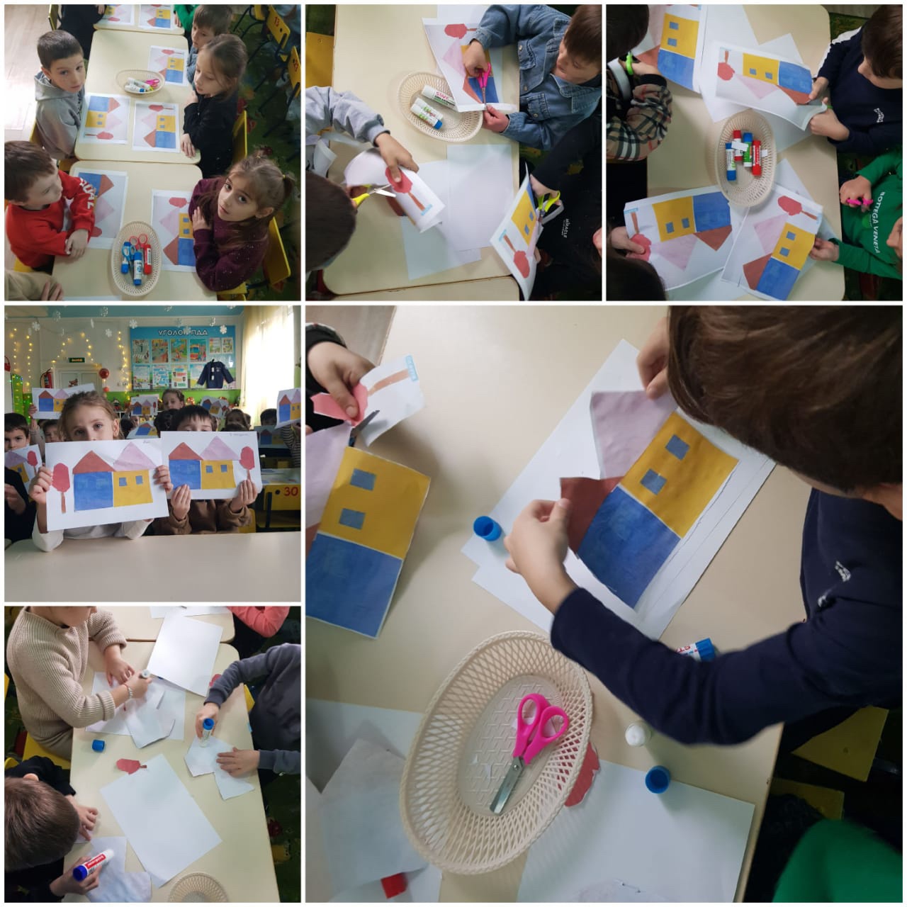 «Дома на нашей улице» аппликация Цель— научить детей создавать композицию, изображающую улицу с домами, и закрепить практические навыки работы с бумагой и клеем.