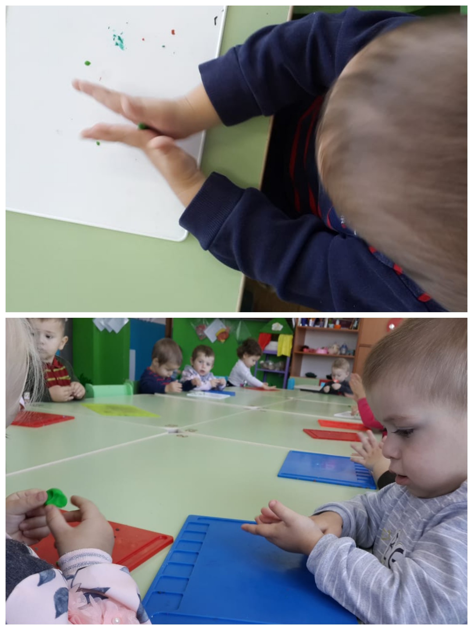 Цель: учить детей отщипывать небольшие комочки пластилина , раскатывать их между ладонями круговыми движениями, познакомить с зеленым цветом.