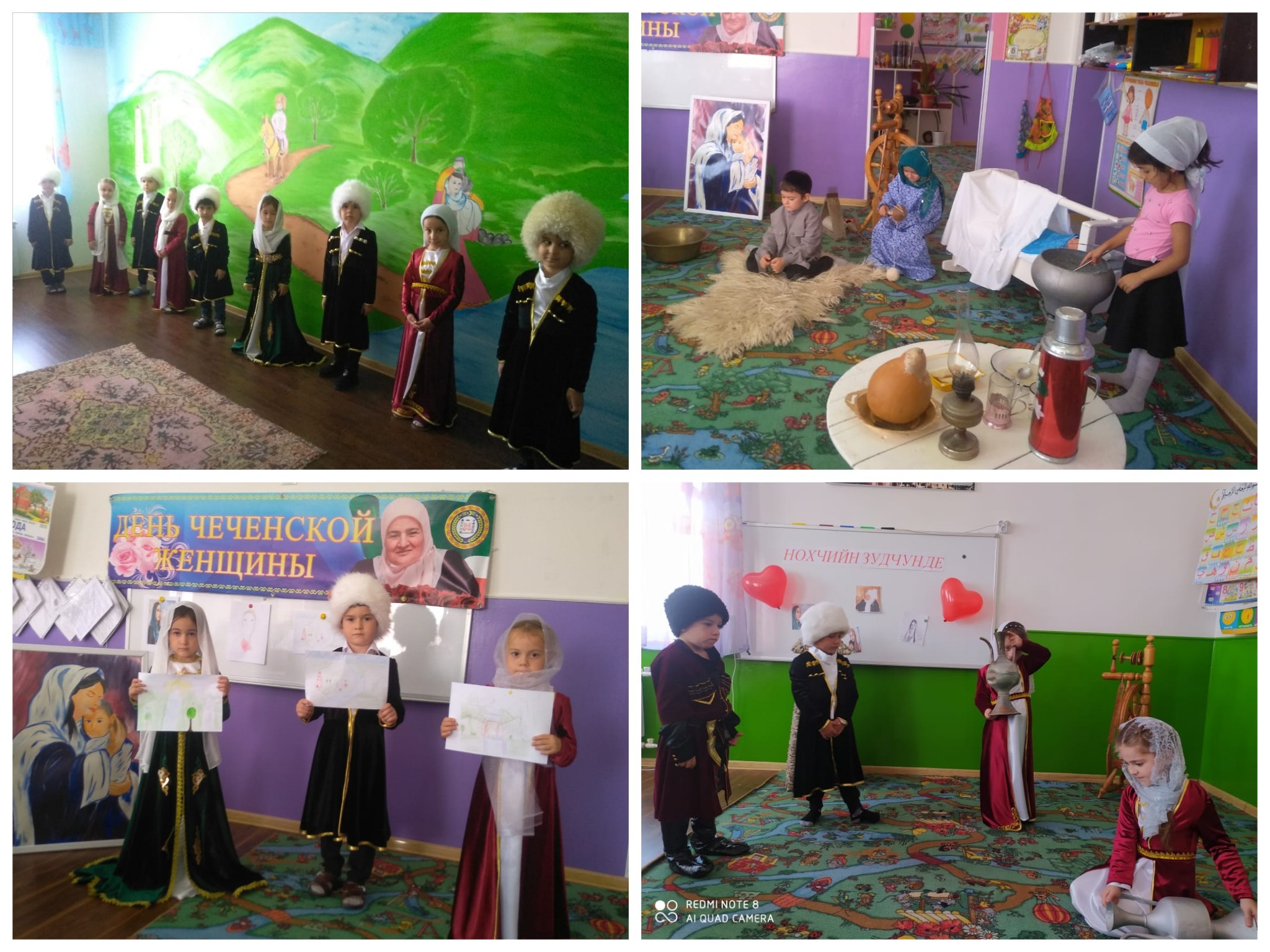 В средних, старших и подготовительной к школе группах проведены тематические беседы и тематические занятия. На занятиях воспитатели ознакомили детей с национальной одеждой чеченской женщины, рассказали о ее нравственности, мужественности, стойкости, терпимости... Дети с воодушевлением читали стихи о бабушках, мамах.