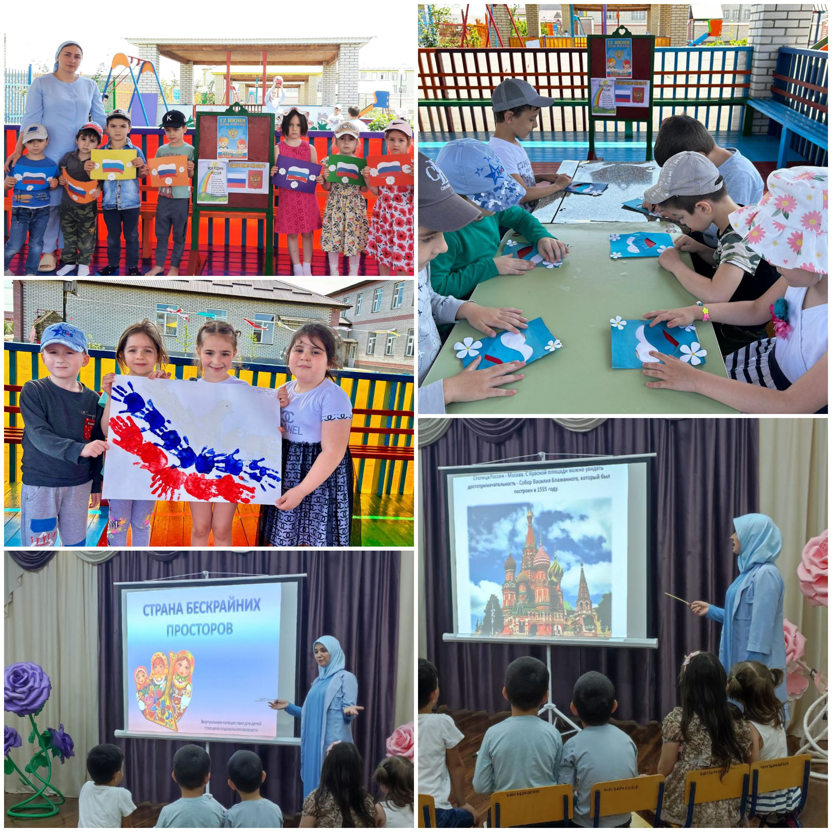 С детьми были проведены тематические беседы, викторина «Моя родина – Россия», организованы русские народные подвижные игры, организован просмотр презентации «Страна бескрайних просторов»разучены песни о России, были рассказаны пословицы о Родине, рассматривались иллюстрации, альбомы «Россия – родина моя», «Москва», провели занятия по продуктивной деятельности – рисование, аппликация.