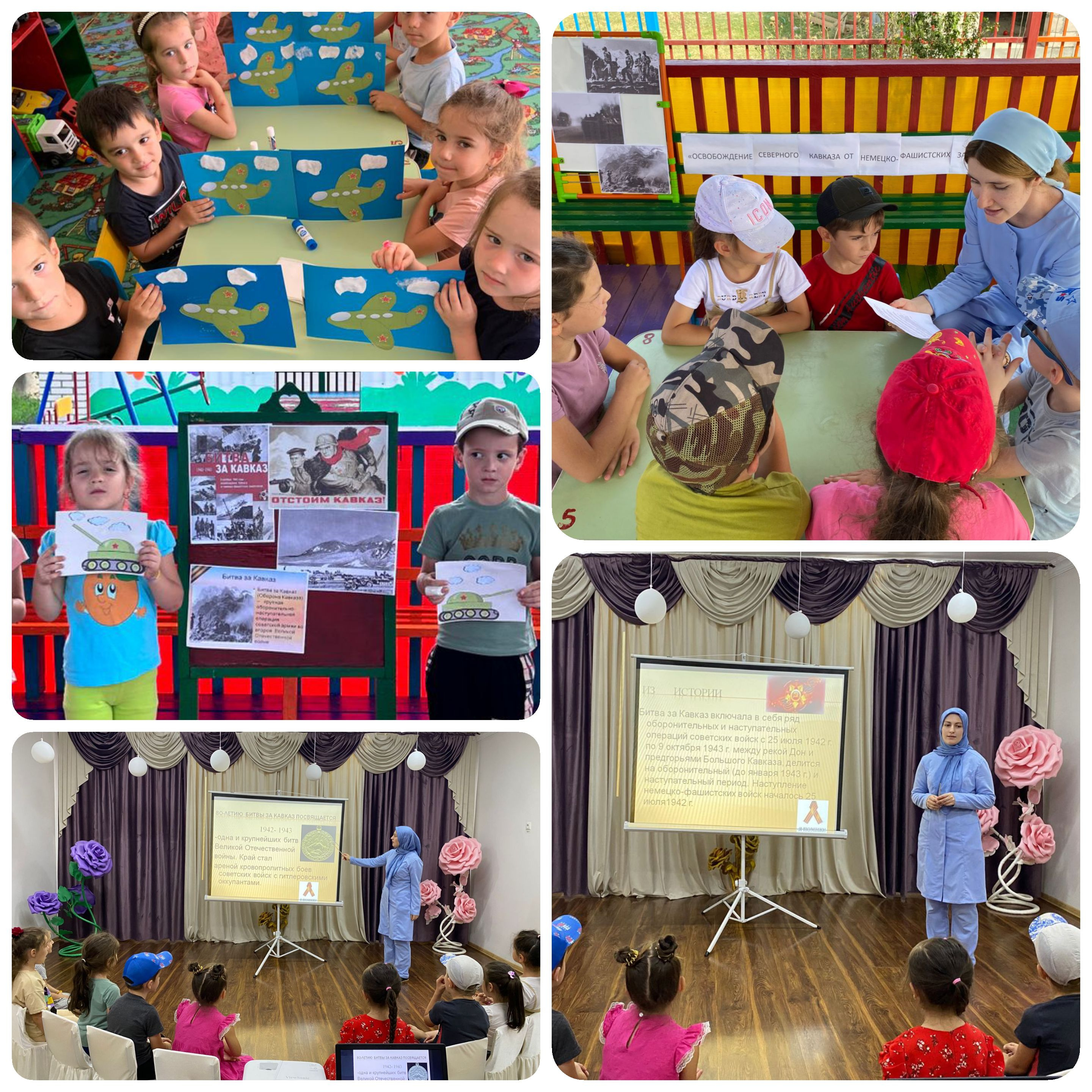 Воспитатели рассказали детям о военных действиях в 1942-1943 гг. на Кавказе, о тяжелом периоде гитлеровской оккупации и подвигах партизан. Беседа в подготовительной группе сопровождалась видеофрагментами хроники времен Великой Отечественной войны. В ходе мероприятия дети узнали, что битва за Кавказ была одной из самых длительных и кровопролитных сражений Великой Отечественной войны. Она продолжалась 483 дня с 25 июля 1942 г. по 9 октября 1943 г. Победа советских войск на Кавказе имела большое политическое и военное значение: была разгромлена южная группировка врага и полностью очищены от гитлеровских войск Кубань, Таманский полуостров и весь Северный Кавказ. В заключение мероприятий дети вместе с воспитателем пришли к выводу о том, что даже спустя 80 лет необходимо помнить о самых героических страницах истории нашей великой страны и своей малой Родины.
