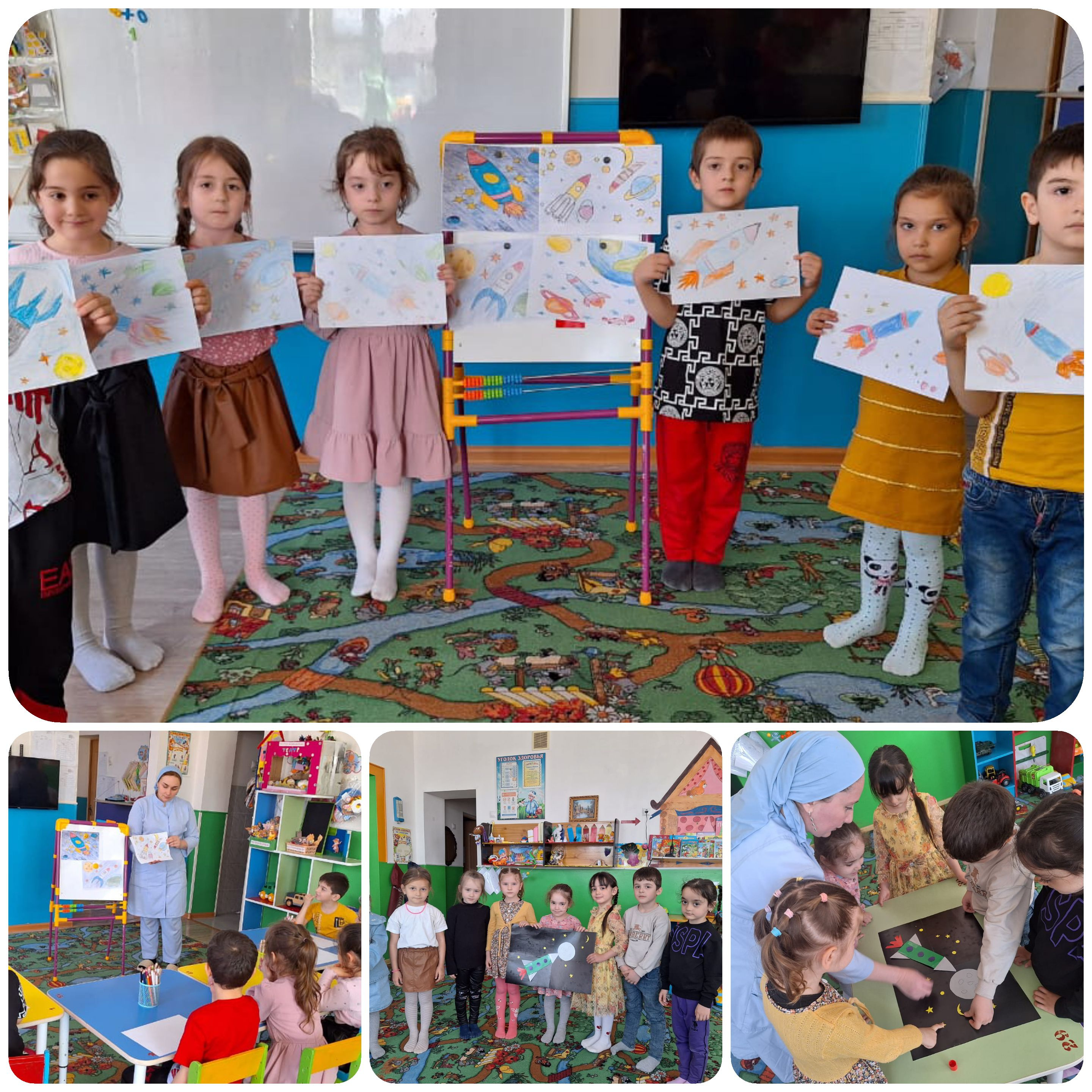 12.04.2024В целях реализации годового плана работы , 12 апреля в нашем детском саду отмечали День космонавтики - памятную дату, посвященную первому полету человека в космос. С дошкольниками проведены интересные беседы о космосе, первом космонавте, женщинах-космонавтах. Воспитатели познакомили детей с космосом для того, чтобы дети узнавали об удивительных открытиях в космосе, о первом спутнике и полете Гагарина, высадке человека на Луну, современных космических станциях и полетах к Марсу. Детям интересна тема космонавтики, особенно мальчикам, поэтому дети слушали беседы с большим интересом. Дети окунулись в историю возникновения космонавтики. И, конечно же, впечатления детей нашли отражение в продуктивных видах деятельности – они рисовали на темы «Звездное небо», «Космос – волшебный мир», выполнили совместную аппликацию.