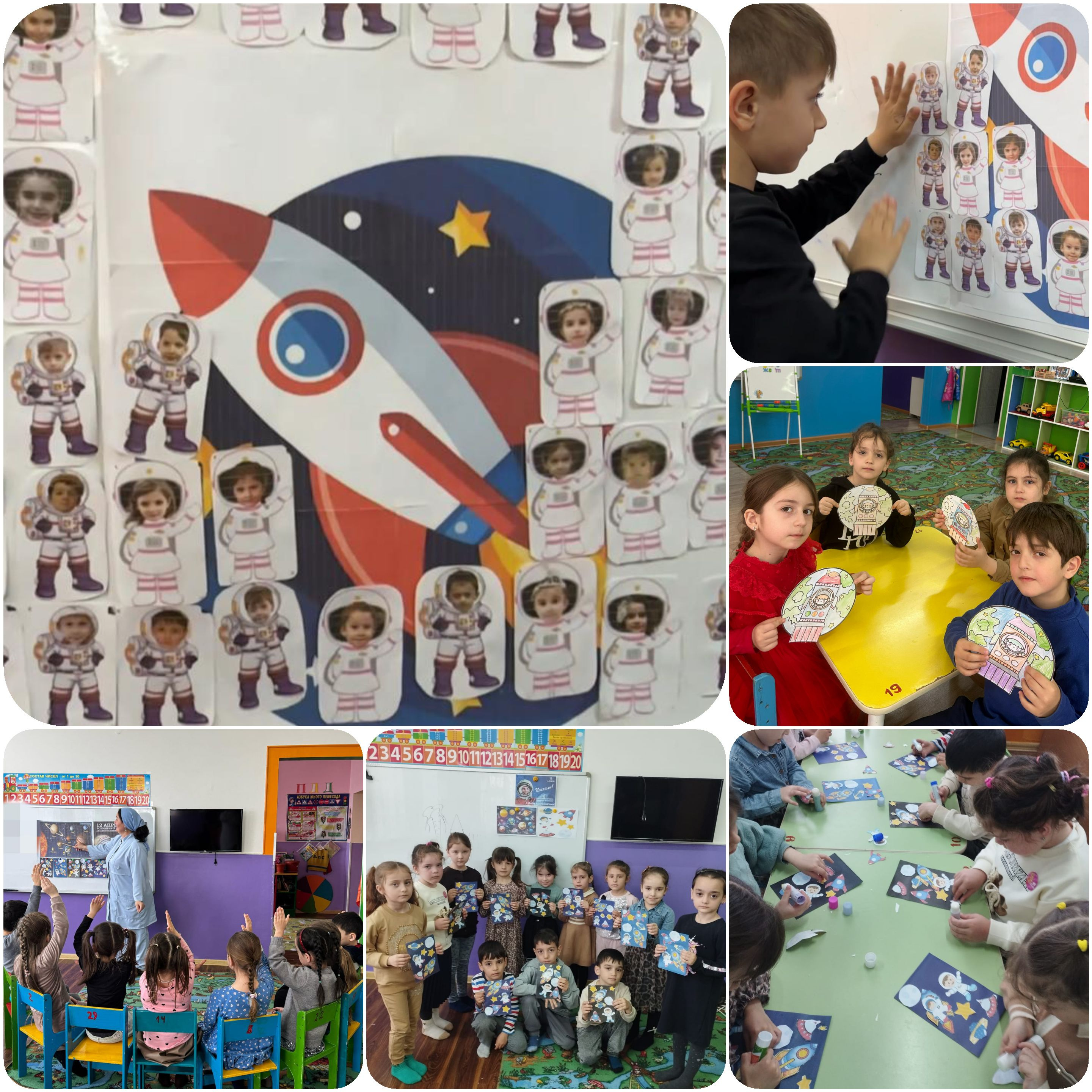 Воспитанники знакомились с информацией о космосе, космонавтах, первом полете человека в космос. На познавательных беседах с большим интересом слушали рассказы о Юрии Гагарине, о собачках Белке и Стрелке, которым удалось до человека побывать в космосе, узнали много интересного об ученых, стоявших у истоков развития космонавтики, о планетах Солнечной системы. После бесед, дети с удовольствием приступили к продуктивной деятельности